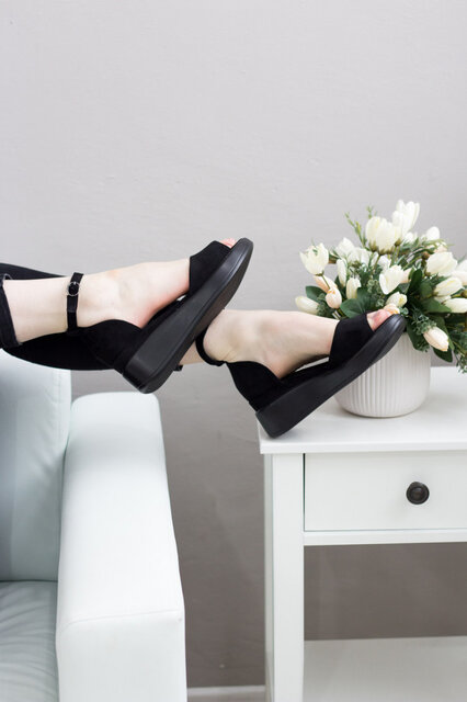 Босоножки из искусственной замши черного цвета модное решение, которого требуют ваши образы. Модель без лишних элементов, дополнена застежкой ремешком. Босоножки женские позволят вам всегда чувствовать себя комфортно и выглядеть стильно.