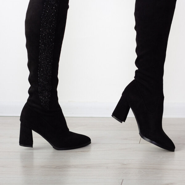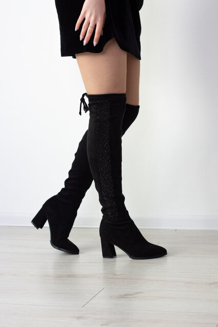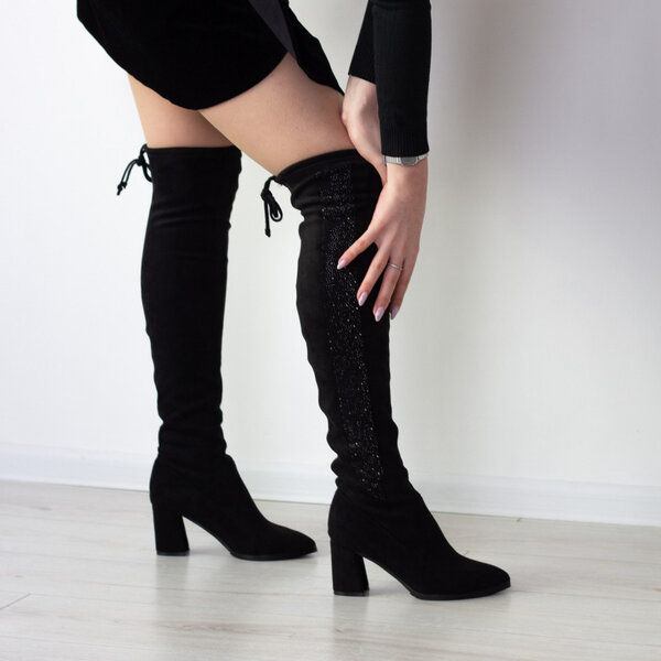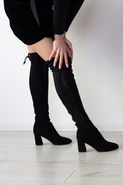 Ботфорты женские черные выполненные из искусственной замши. Модель представлена в демисезонном варианте внутри искусственный флис. Стильные и комфортные женские ботфорты чудесно впишутся в гардероб.