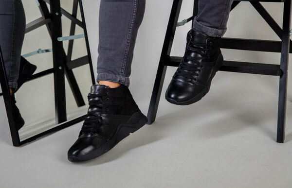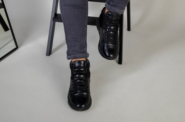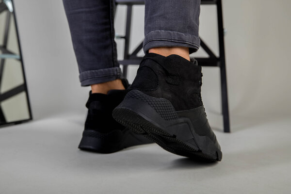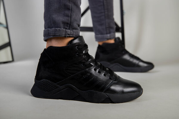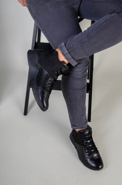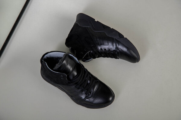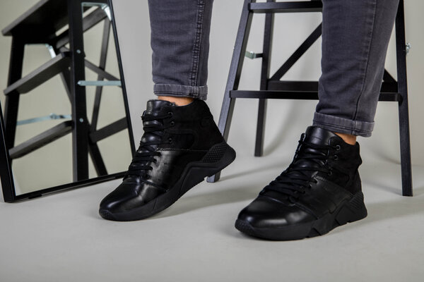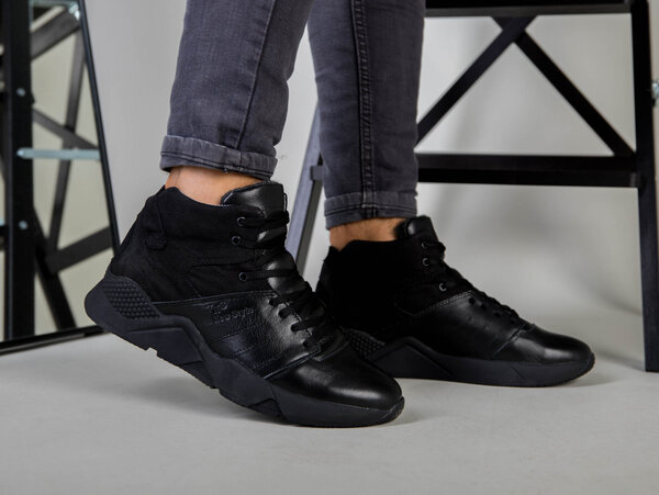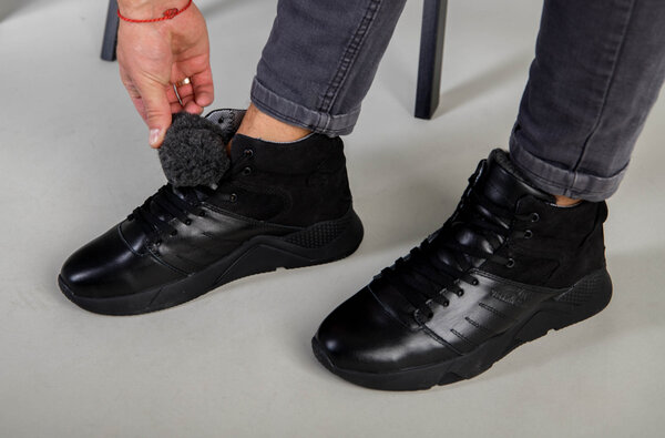Ботинки мужские кожаные черного цвета с вставкой нубука зимние
