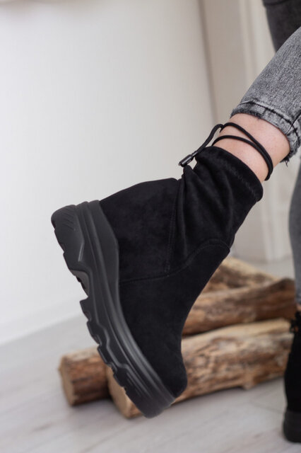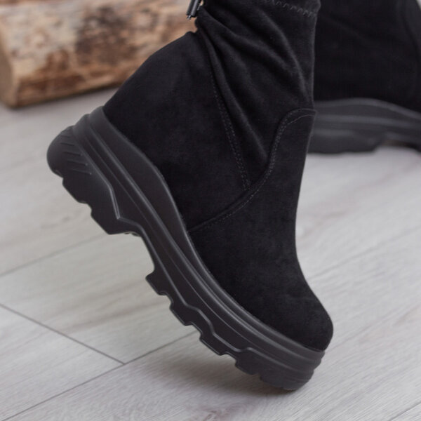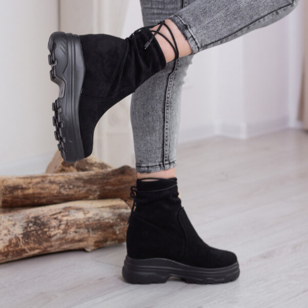 Ботинки женские выполнены из искусственной замши, внутри подкалка из флиса. Модель аккуратно сидит на ножке. Дизайн этой модели в черном цвете. Женские ботинки Curly – позволят вам сделать ваш образ еще более изысканным и утонченным.