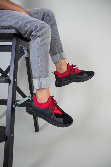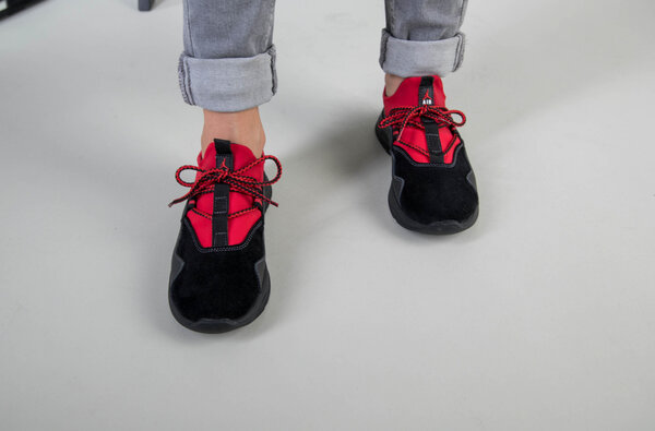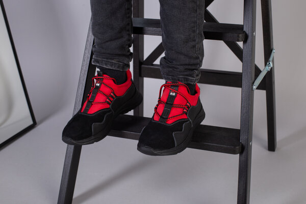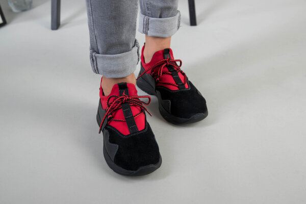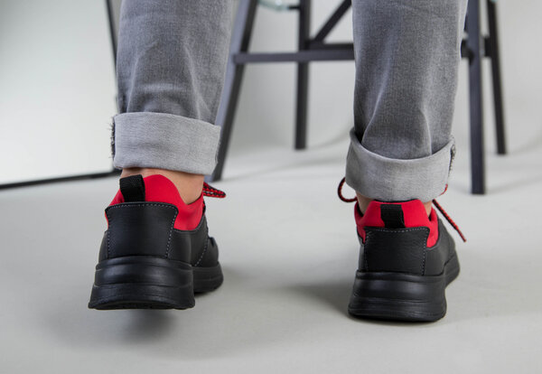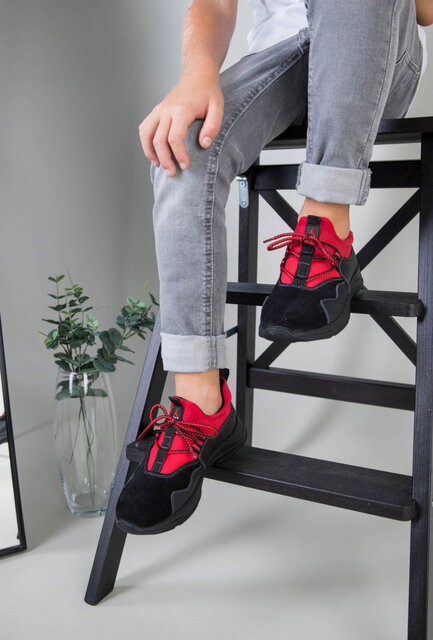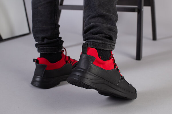 Черные кроссовки для мальчика с кожи и замши с вставкой красного текстиля