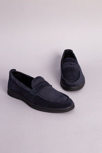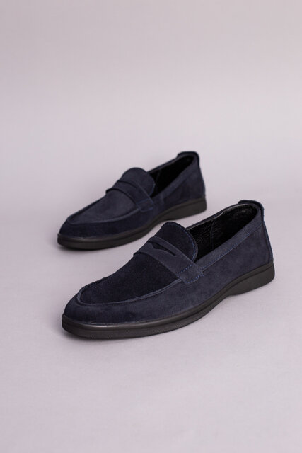 Лоферы мужские замшевые темно-синего цвета на черной подошве