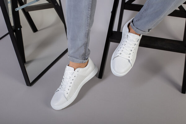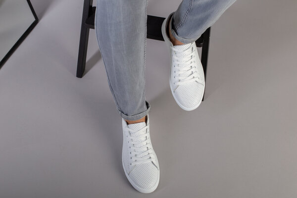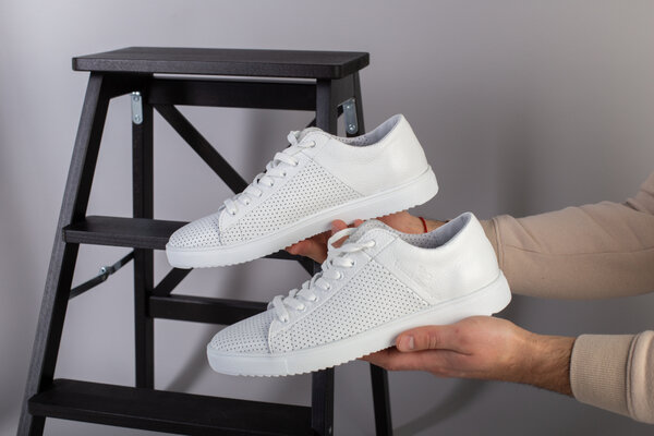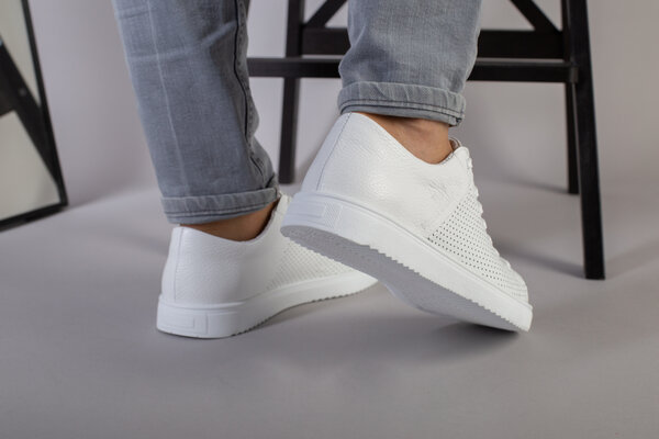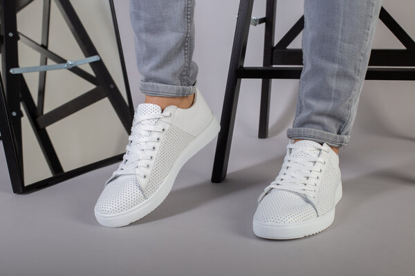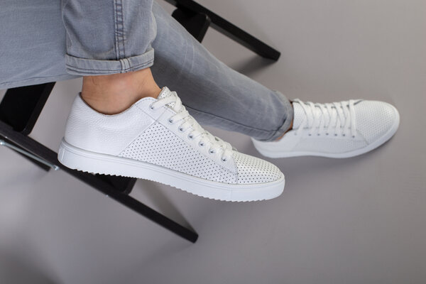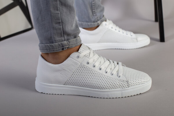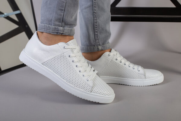 Кеды мужские кожа флотар белые с перфорацией на белой подошве